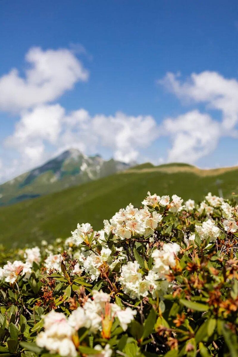 Рододендрон Кавказский - красивоцветущий вечнозелёный кустарник, самый крупный в семействе вересковых. Это древнее растение появилось на Земле несколько миллионов лет назад. Его название произошло от греческих слов «ронон» - роза и «дендрон» - дерево. Достигает в высоту 1—1,5 м. Окраска цветка сильно варьирует от чисто белой до бледно-кремовой или бледно-розовой. Цветет рододендрон в начале лета. Его пышные соцветия образуют гигантские клумбы, красиво сочетающиеся с темно-зеленой листвой. Рододендрон является представителем горно-лугового субальпийского ландшафта. Всего рододендрон насчитывает около тысячи видов, на Кавказе их 5. Этот кустарник предпочитает влажные, прохладные места обитания, образует на склонах специфический ярус растительности. Академик Н. А. Буш отметил, что рододендрон является пионером деревянистой растительности. Местами он далеко уходит в альпийскую зону, быстро проникает в изреженные леса и даже на заторфованные почвы. Распространён на высоте 1600—3000 метров