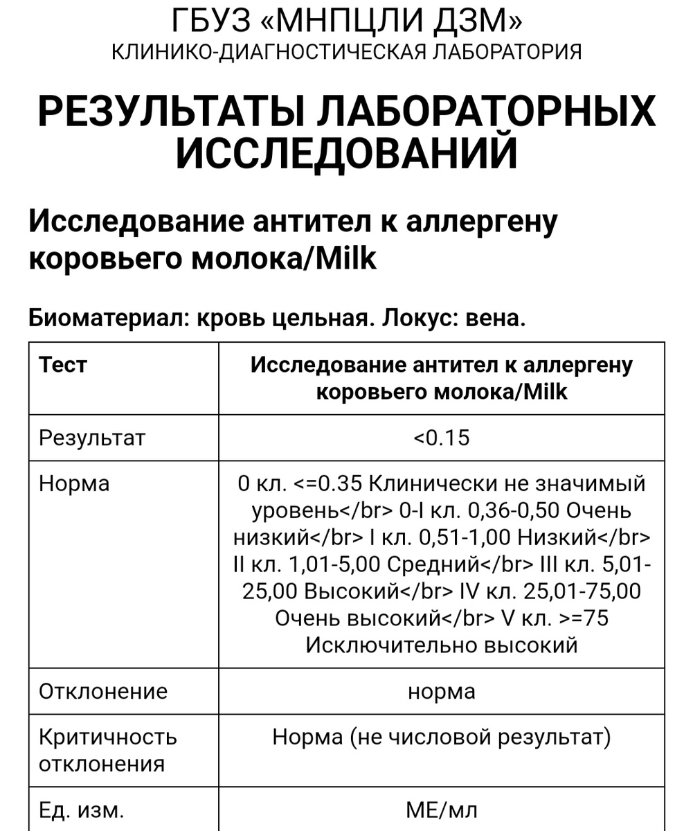 Вчера ближе к десяти ночи пришли-таки результаты анализов на аллергические реакции. Если честно, я в какой-то мере даже ожидала увидеть увеличенные показатели на белок коровьего молока и пшеничную муку, ведь тогда бы можно было констатировать, что "ротовое дыхание" сына вызвано именно этим - протеканием аллергии, которая даёт нагрузку на имунную систему Вани. Так вот, переходим к сути. Как говорится, есть две новости - хорошая и плохая. Начнём, пожалуй, с хорошей: аллергия не обнаружилась. Вот вообще. Поэтому со спокойной душой можно разрешать сыну и дальше "дуть" столь обожаемые молочные коктейли, заедая их печеньем. Манную кашу, кстати, тоже можно. Ох, как сын её любит! На "пыльцу" тоже сдали - аллергии на берёзу и тимофеевку нет Ну а плохая новость в том, что нам не удалось понять, почему у Вани иммуноглобулин аж 2 144 ме/мл при норме в 0 - 60 ме/мл 🙄 Есть теория, гласящая, что этот показатель повышен просто потому что "имунная система малыша ещё развивается". Коллега, мама троих