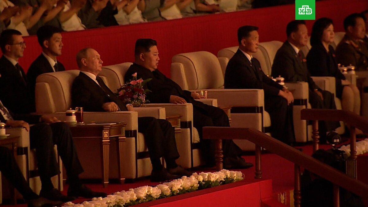 [ Смотреть видео на сайте НТВ ] В Пхеньянском доме спорта прошел концерт в честь визита Владимира Путина. Владимир Путин и Ким Чен Ын, а также делегации России и КНДР, посетили концерт в Пхеньяне. Перед тысячами зрителей музыканты исполнили корейские и русские песни. Так, на концерте прозвучали песни о войне, в том числе «Священная война» и «Катюша», и отрывки из композиций SHAMAN («Встанем»), Григория Лепса («Родина-мать»), Олега Газманова («Россия» и «От Волги до Енисея») и группы Любэ («Отчего так в России березы шумят»). В зале растянули огромный транспарант «Приветствуем президента Российской Федерации товарища Владимира Путина!» на корейском и русском языках. А после концерта Путин пожал руку Ким Чен Ыну. Кроме того, лидеры России и КНДР через переводчиков пообщались друг с другом. Владимир Путина накануне, 18 июня, вечером прилетел в Пхеньян. А сегодня лидеры России и КНДР провели переговоры и подписали несколько документов, в том числе договор о всеобъемлющем стратегическом пар