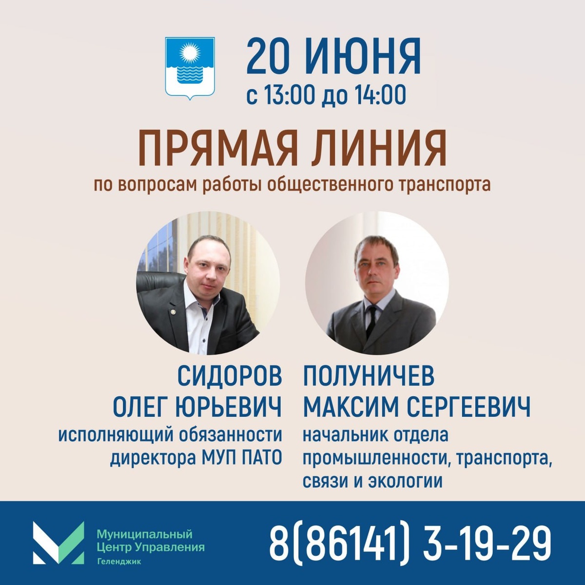 В четверг, 20 июня, с 13:00 до 14:00, начальник отдела промышленности, транспорта, экологии и связи администрации города-курорта Максим Сергеевич Полуничев и и.о. директора МУП ПАТО Олег Юрьевич Сидоров ответят на ваши вопросы о работе общественного транспорта, приобретении проездных и другие интересующие вас темы.
