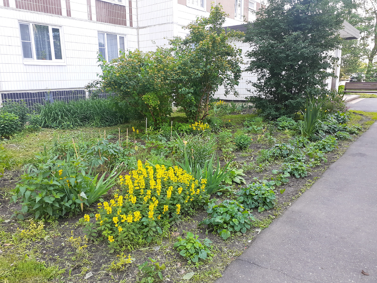 На клумбе зацвел вербейник. Вид на клумбу с одной стороны. Правее. У нас косили газоны, скосили траву на той части газона, что за клумбой и слева от клумбы. Это пока необработанная целина. Еще правее. Палочки стоят - это я пионы подвязала, они слегли от бесконечных ливней. И еще правее. Посадила цветы вокруг куста. Вот поближе. Вид на клумбу с другой стороны. Цветет розовая спирея. В углу дома весной посадила ирисы и вербейник. Вербейник легко пересаживается, хорошо принимается и сразу цветет. До куста тоже кусок земли необработанный. Между рядами посеяла космею. Вдоль стены дома собирается цвести лилейник. Вид сзади. Вот это кусок целины. Там, где кончается бетонный слив, растет белая фиалка. Там слой земли небольшой, глубже - бетон. Справа растет роза. Вот как-то так :)