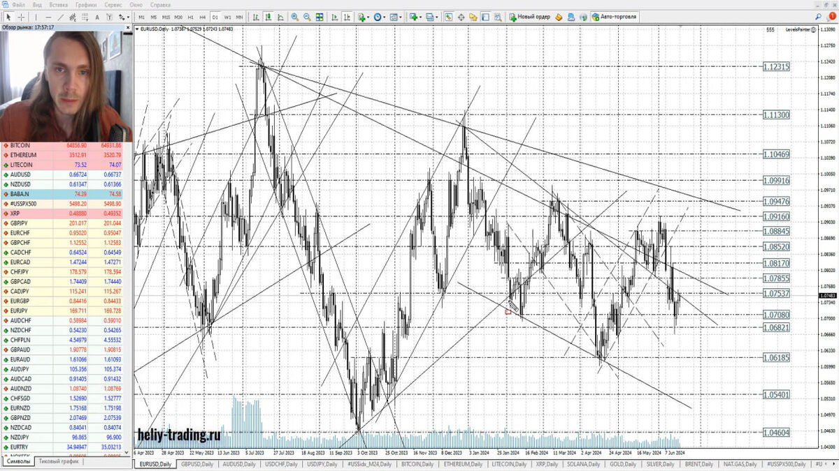 Прогноз форекс, акций и криптовалюты на 20 - 21 июня 2024: eurusd евро/доллар, gbpusd фунт/доллар, audusd, usdchf доллар/франк, usdjpy доллар/иена, индекс доллара, usdrub доллар/рубль, cnyrub юань/рубль, криптовалюта, биткоин, эфириум, лайткоин, рипл, солана, bnb, тонкоин, ноткоин, альткоин, золото xauusd, серебро xagusd, нефть brent, природный газ, индексы, s&p500, nasdaq, акции, сбербанк, газпром, лукойл, роснефть, ртс, ммвб, трейдинг, инвестиции, фондовый рынок. EURUSD ЕВРО/ДОЛЛАР – краткосрочная восходящая коррекция остановилась на нисходящей линии тренда, образовав ложные пробои с консолидацией.