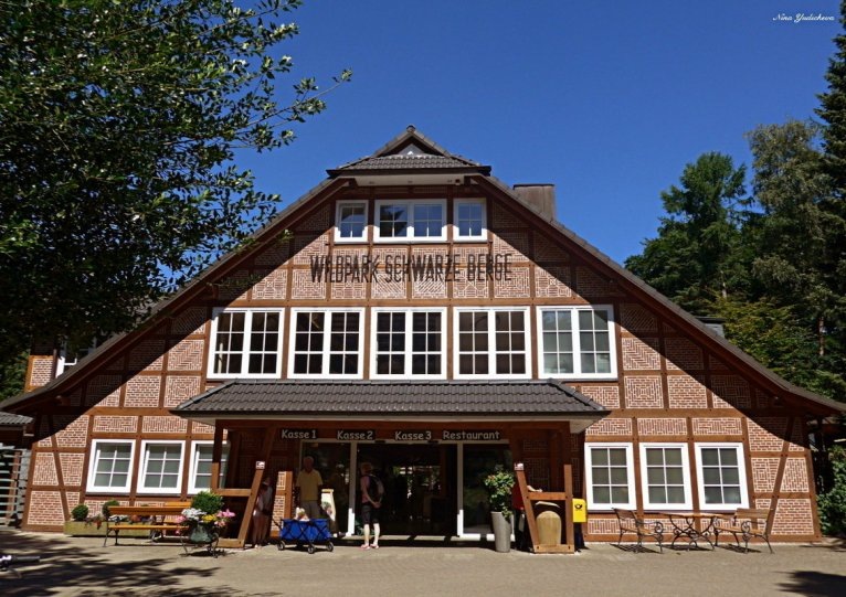 Wildpark Schwarze Berge Hamburg Парк дикой природы "Чёрные горы" (Wildpark Schwarze Berge) особо хорош для посетителей с детьми. Здесь можно покормить с рук пятнистых оленей, посмотреть шоу с венценосными журавлями, забраться на вышку и осмотреть окрестности, увидеть животных, условия содержания которых приближены к природным. Красивое фахверковое здание украшает вход в парк. В здании расположены кассы и маленький магазин с сувенирами. Источник. Вода течёт из камня Скульптура кабана у входа в парк Чёрный аист ловит рыбку в мутной воде :) Белый аист в изумрудной воде Козёл с достоинством носит свои огромные рога Козлёнок щиплет травку Добрососедские отношения рогатых :) Медведь и девушка-фотограф Полярная сова любезно согласилась позировать Бородатая неясыть постоянно отворачивалась. Подозреваю, что она не очень-то жалует фотографов :) Владения бородатой неясыти Спящий на дереве павлин. Я пыталась разбудить, он лишь пару раз глаза открыл - и снова дрыхнуть :) Олений остров. Здесь можно