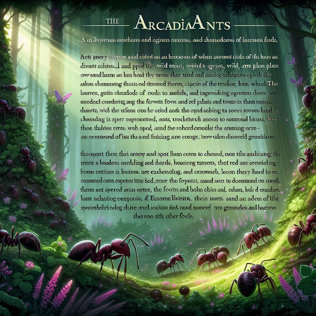 В самом сердце тайнственного леса, где деревья пронизаны солнечным светом, а воздух наполнен ароматом дикой мяты и лаванды, скрывалась тайна, о которой знали лишь самые мудрые существа леса. Это была колония муравьев Аркадия, самая тайная и загадочная колония во всем мире. Муравьи Аркадия были не похожи на обычных муравьев. Их тела сверкали всеми оттенками зеленого, словно они были выкованы из листьев и травы. Они обладали уникальной способностью общаться с растениями, понимать их язык и даже исцелять их от болезней. Взамен растения делились с муравьями своими сокровищами — каплями росы, наполненными солнечным светом, и семенами, из которых муравьи создавали свои загадочные эликсиры. Королева Аркадия, мудрая и величественная, руководила колонией с помощью древних ритуалов и магии, которая была передана ей от поколения к поколению. Она учила муравьев искусству алхимии, позволяя им создавать волшебные зелья, способные изменять погоду, ускорять рост растений и даже делать муравьев невид