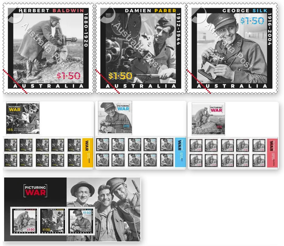 Первые пять марок, "День 80-й высадки десанта в Нормандии - дорога на Париж", изображают новаторскую высадку десанта в июне 1944 года в ходе освобождения Парижа. На первой марке в этой коллекции представлены кадры, снятые в День высадки с острова Мэн Норманом Клагом из армейского кино-фотографического подразделения, впервые использованные на марке.