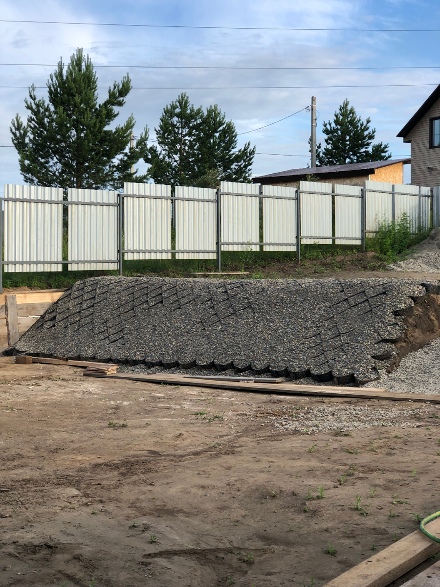 На нашем участке был небольшой склон. Мы наняли трактор с ковшом и выбрали нижнюю часть земли, переместив ее наверх. Склон укрепили специальной сеткой и засыпали щебнем для прочности. Потом это все будет засыпано землей и посеяна газонная трава. Участок получился в двух уровнях. Поэтому рабочие укрепляют забор, заливают стенку. Забор нам достался от застройщика. Посередине будет лестница наверх. Со сварщиком уже договорились, сварит из железных уголков, ступени будут деревянные. Между посадками будет газонная трава, все руки не доходят посеять. Максим снова расцвел. Хосты и елочки прижились все. Говорят, хосты уже не модно садить, но пусть растут. Люк будет закрыт декоративным колодцем. В теплице так Теплые грядки внизу участка Теплица У Каси за спиной щебень и песок, там будет баня Бодрые баклажаны и болгарские перцы. Причесанный утренний кот
