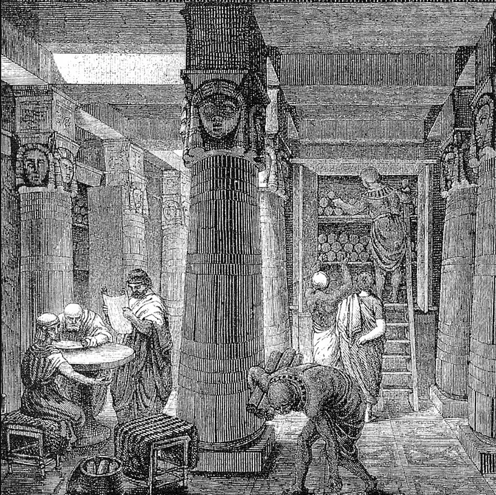 Обширное собрание трудов, хранившихся внутри, включало работы выдающихся мыслителей и писателей, таких как Гомер, Сократ и другие, было трагически утрачено.