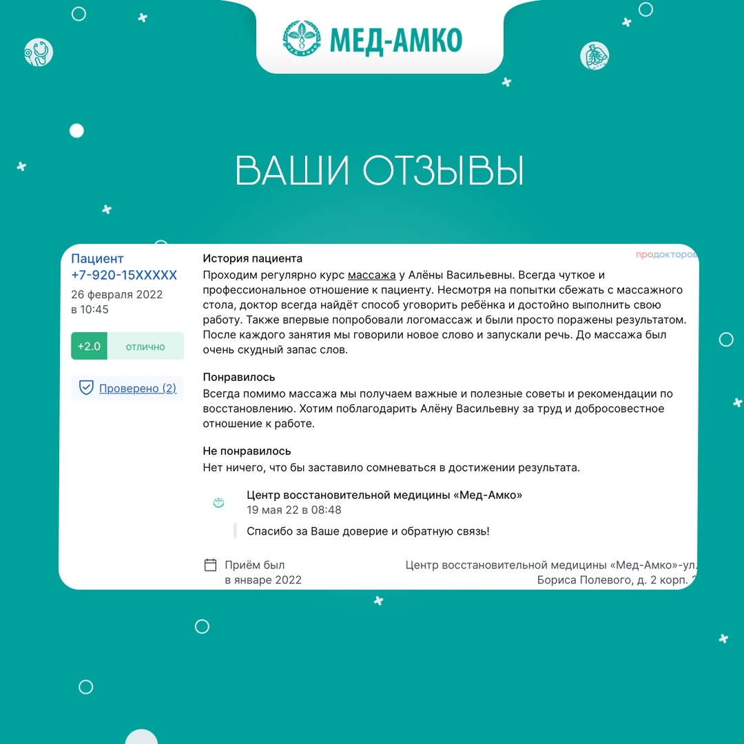 Мы ценим ваш отзыв и рады видеть, что наши пациенты возвращаются к нам снова и снова! Спасибо за ваше доверие. Мы обещаем продолжать быть вашими надёжными партнёрами в заботе о вашем здоровье! Ваш медицинский центр «Мед-Амко»