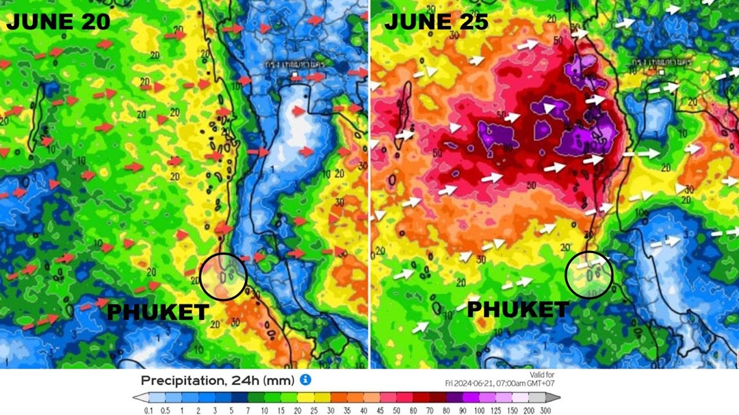 На Пхукете прогнозируется продолжение дождей с штормами на море и угрозой наводнений на суше до 25 июня. Прогноз показывает, что осадки задержатся как минимум на следующие семь дней, при этом сохранится вероятность наводнений на суше, а капитанам на море придется быть более бдительными.