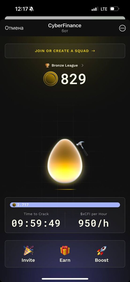 Немного о проекте Cyber Finance Cyber Finance - это безгазовая бессрочная биржа на Blast, которая предлагает кредитное плечо до 50x, обеспечивая высокую доходность и высокую ликвидность. Но мы собираемся лишь заработать жетоны, потом выгодно их продать. Рассмотрим приложение Как добываются жетоны? Откройте бота по ссылке и нажмите «Старт». Как только яйцо будет разбито, вы получите уведомление о необходимости получить свои жетоны. Все достаточно просто, не нужно кликать, просто заходим в определенное время и все. Как увеличить добычу? Приглашаем друзей и получаем до 10% от его заработка. Увеличить добычу мы можем также через через вкладку Boost Здесь прокачиваем на максимум и часы и количество монет в час. Мне интересно заходить реже и снимать, нежели заходить каждый час. Поэтому я прокачал вот так. Монеты, чтобы прокачаться вы можете взять за выполнение заданий. Они достаточно простые и занимают мало времени. Вкладка Earn Как по мне проект привлекательный так как в партнера