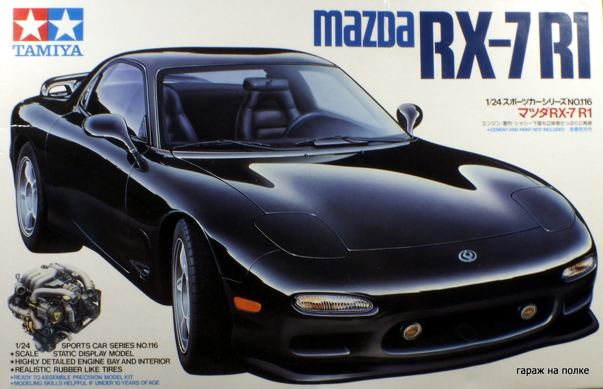 Здравствуйте дорогие друзья! Продолжаю рассказ о новом проекте Гаража На Полке. В предыдущий раз вы могли увидеть обзор сборной модели MAZDA RX-7 R1 от фирмы TAMIYA, а сегодня, покажу некоторые этапы сборки этой модели. Сразу хочу сказать, что при хорошей детализации и проработке, набор от Тамии позволяет собрать очень достойную модель даже моделисту с небольшим опытом, хотя есть нюансы, о которых я скажу позже. Внимательно изучив инструкцию, приступим к сборке. Первая позиция руководства, предлагает собрать двигатель. Двигатель этой Мазды не совсем обычный, и подробнее о нём расскажу когда буду представлять готовую модель. Для дальнейшей сборки потребуется окраска моторного отсека и днища кузова. В моей модели, основным цветом будет желтый, заодно крашу кузов. Применена краска Mr.Color C4 желтый глянцевый. Для "теплоты" тона добавлено несколько капель красного С3. Здесь хочу сделать замечание. Все основные детали в этом наборе выполнены из пластика чёрного цвета – в том числе и кузов
