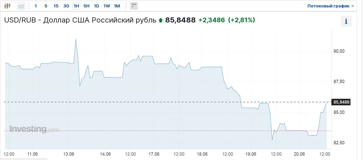 В среду, 12 июня, Минфин США ввел санкции в отношении Московской биржи и Национального клирингового центра, который выступает посредником между сторонами. В результате Мосбиржа объявила о прекращении торгов в долларах и евро с 13 июня. Целью было дестабилизировать курс рубля. И действительно курс взлетел с 89 рублей за доллар до 91 рубля. С 8 до 9 часов 13 июня. К 11 часам упал до 87 рублей. Дестабилизировать рубль удалось всего на 3 часа. Прошла неделя. Сегодня 20 июня. Курс скачет с 83 до 86. Прямых торгов нет. Курс вычисляемый. Но заметно, что торгами на Мос.Бирже курс занижали! Теперь такого инструмента не стало. Рубль вырос. Экспортеры несут убытки. Точнее получают меньше рублевой прибыли. Я думаю, что Центробанк справится с такой неприятностью, как неожиданно выросший рубль и вернет его в назначенный коридор 87-92 рублей за штуку. Такой курс вроде бы всех устраивал. Хотя может и не вернет. Нефть, серебро, золото и другие ресурсы тоже поползли вверх. Причем с одинаковым графиком.