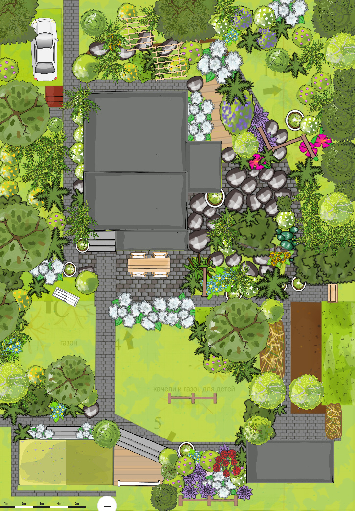 Снова посмотрим на план. То, что справа от дома, сегодня и будем рассматривать. На уровне террасы - ручей и цветники вокруг него. Сейчас там из цветов, помимо герани и аквилегии, выделяется валериана липолистная. Также рядом папоротники и хосты. Оноклея чувствительная. На переднем плане фиалка соррория. Клематис жгучий сзади. Тут сзади бузульник. На дорожку рядом я выставляю хосты в горшках. За ними ирис болотный. А с другой сторны горки - площадка со всякой мелочью. Камнеломка тенистая, хосты, арабис, яснотка и прочее, что само насеялось. Эта хоста - спорт от Голд Стандарт, вместо голубоватого края у нее белый, но поскольку это я сама листочком размножила, она часть почек уже вернула к исходному сорту. Получилась такая мешанина. Камнеломка тенистая. Яснотка. Папоротники асплениум и адиантум стоповидный, а также пузырник клубненосный. Вид на этот уголок из сада за домом. И сад за домом. Там вдоль забора рододендроны. Они уже отцвели. Но скоро зацветет гортензия древовидная. Примула яп