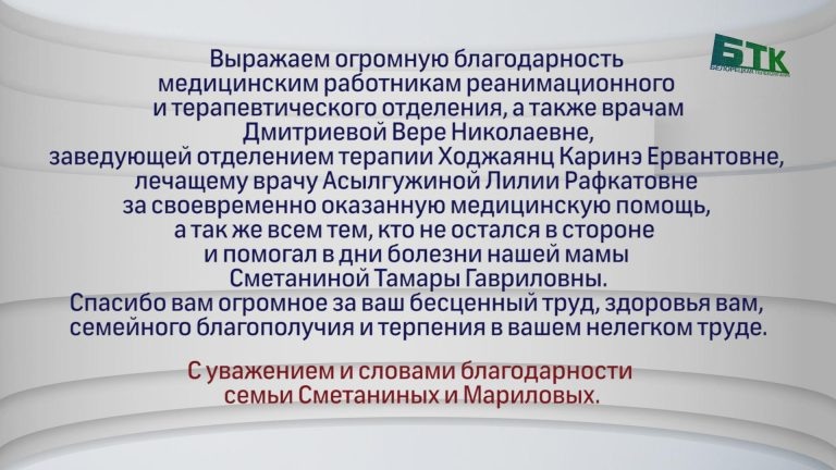 Выражаем огромную благодарность медицинским работникам реанимационного и терапевтического отделения, а также врачам Дмитриевой Вере Николаевне, заведующей отделением терапии Ходжаянц Каринэ Ервантовне, лечащему врачу Асылгуженой Лилии Рафкатовне за своевременно оказанную медицинскую помощь, а так же всем тем, кто не остался в стороне и помогал в дни болезни нашей мамы Сметаниной Тамары Гавриловны.