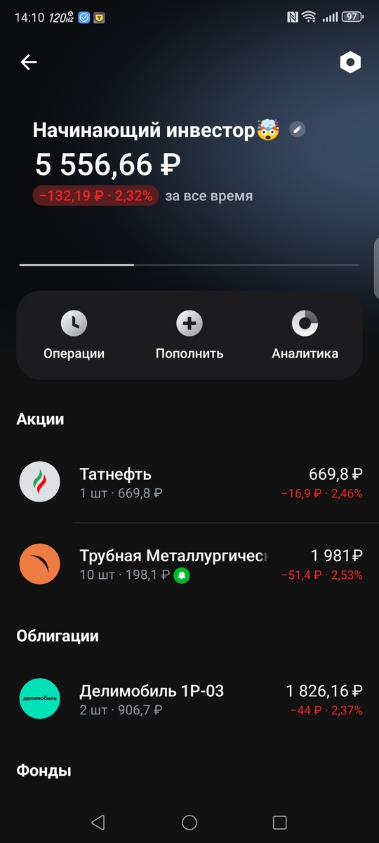 И Так добрый день уважаемые читатели Мой брокер : Сегодня 20.06.2024 Я купил 16 шт. Фонд (TGLD) Потихоньку рынок разворачивается на рост. Завтра на 10руб. Будет увеличено ежедневное пополнение . Так будет каждую неделю. Посмотрим что получится . И так на сегодняшний портфель составляет 5556 руб.