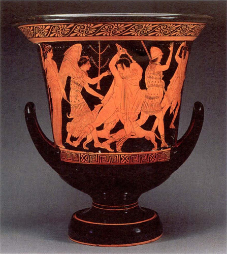 В наказание за наблюдение за купанием обнаженной богини Артемиды Актеон был превращён ею в оленя. И его же охотничьи собаки разрывают юношу на части. Этот классический миф о cексе и наcилии позже был перенят римлянами и бесконечно воссоздавался в более позднем европейском искусстве. Художник расписавший около 430–420 г. до н.э. этот краснофигурный кратер отчасти думал, как его древнеегипетские коллеги: каждое лицо показано в профиль, но всё остальное находится в реалистическом движении. И всё же мастер нарушил строгие правила для изображений и создал нечто совершенно новое. Ноги Актеона показаны совершенно не так как у остальных. он стоит как-будто лицом к нам, лишь повернув голову вбок. Умение рисовать перспективу и изобретение ракурса стали революционными достижениями в искусстве. Идея рисовать вещи так, как они выглядят на самом деле, а не так, как их лучше всего узнать, взяла верх. Древние греки, такие как Вазописец диносов, применили свой независимый дух и изобретательность