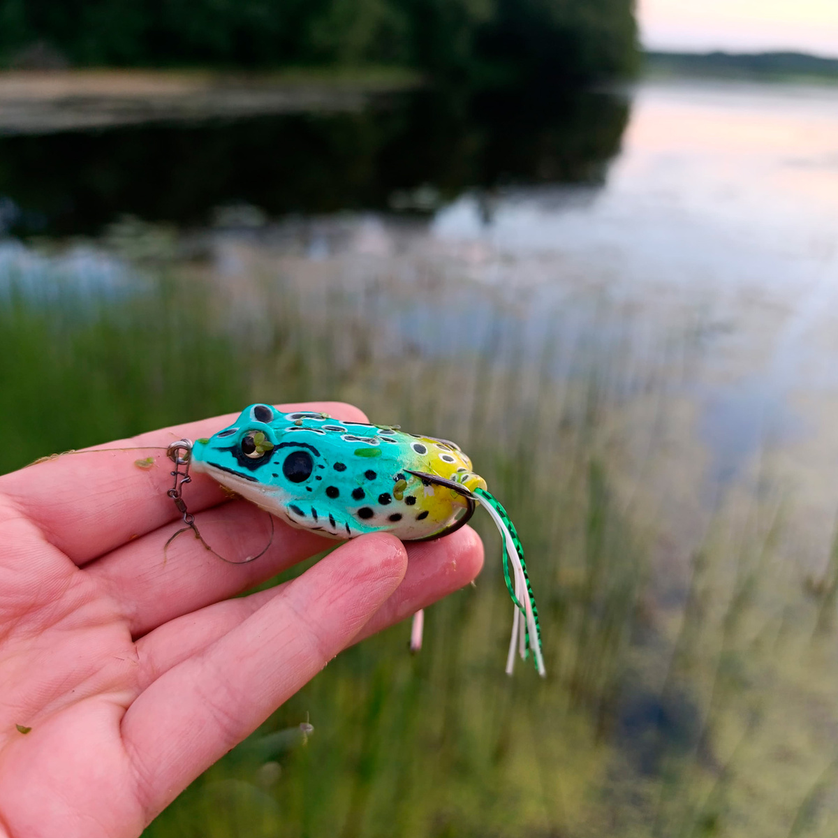 Лет десять тому назад я впервые узнала, что есть такая приманка «лягушка». Мы семьей отдыхали на Валдае, пытались с папой ловить хищника, но безрезультатно. После очередной рыбалки сидели на причале и искали оправдание своим рыбацким промахам. К причалу подрулил «крутой мэн» на катере. Разговорились. Он достал связку щук и заявил: — В этом году на озере клюет только на лягушку! — Что за лягушка такая? — поинтересовались мы с озадаченным видом. Мужик показал приманку и любезно рассказал, как на нее надо ловить. Я слушала и впитывала, как губка. Тогда я не была подписана на рыболовные группы и блогеров не смотрела, так что рассказ того рыболова был моим единственным источником информации. Он дал мне одну лягушку и сказал: — Дерзай, юнга! Оставшиеся пару дней каникул на озере я плавала на веслах по заводям и кидала эту лягушку до трясущихся рук. Помню, когда увидела первую поклевку (зубастая вылетела из воды за приманкой), я взвизгнула и чуть не выскочила из лодки от ужаса и восторга! Тог