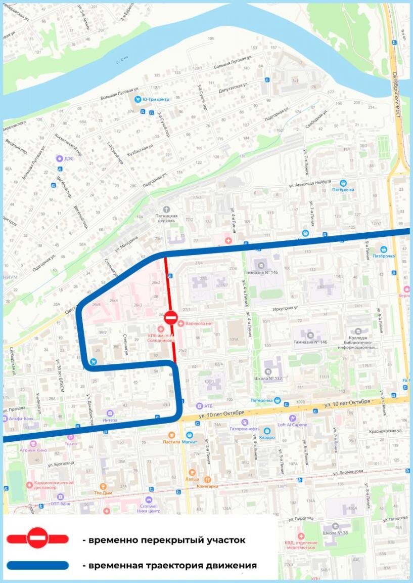 В связи с этим общественный транспорт, который проходит по этой улице (автобус 59 и маршрутка 386) направят в объезд. Как сообщает пресс-служба департамента транспорта, при движении со стороны улицы 10 лет Октября транспорт будет поворачивать налево на Звездова, затем направо на Декабристов и по ней выезжать на Омскую. В обратном направлении — аналогично (см. приложенную схему).