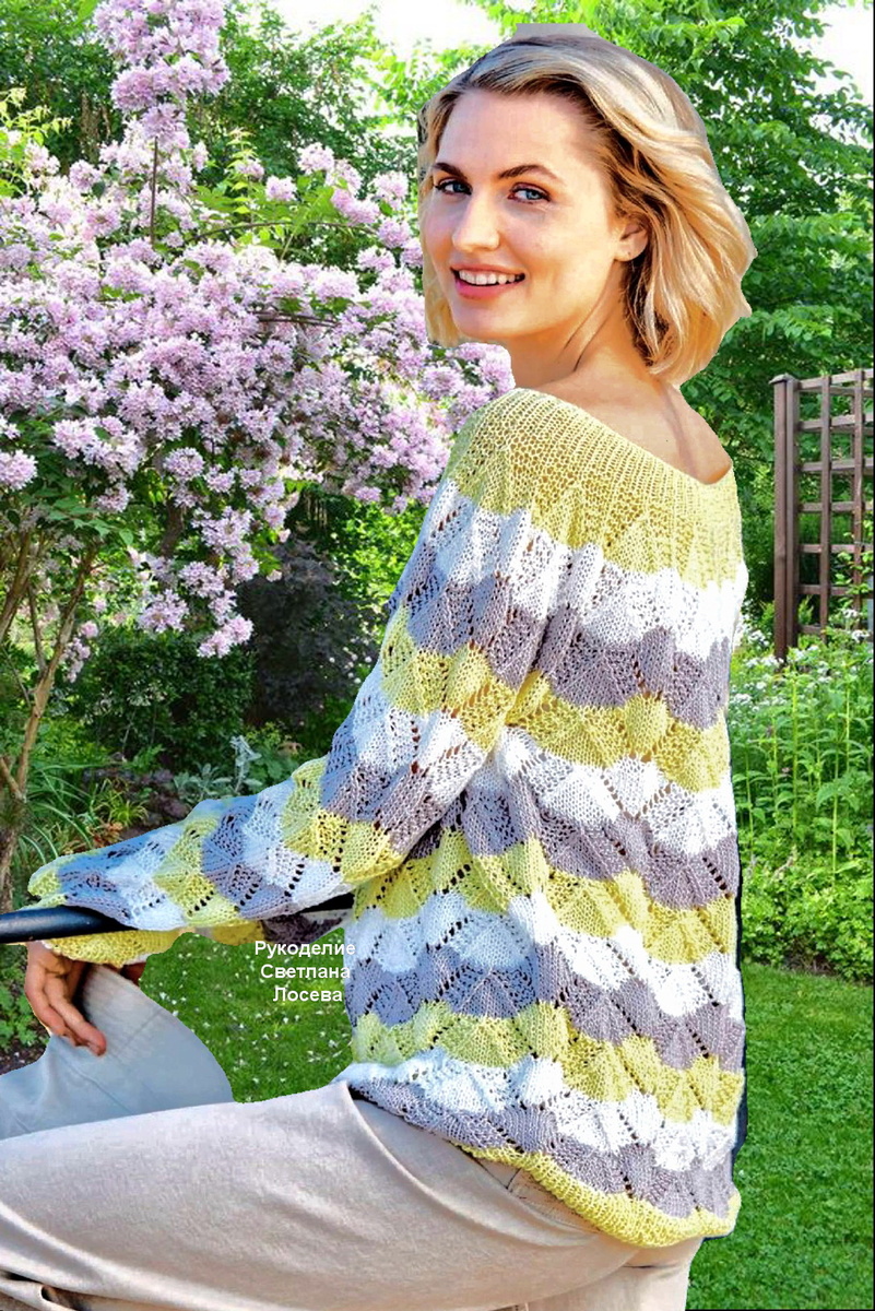 Вязаный спицами джемпер с ажурным геометрическим узором и кокеткой — это стильный и нарядный элемент гардероба, который сочетает в себе гармонию трёх цветов: белого, салатового и серого. Свободный стиль этого изделия позволяет комбинировать его с различными элементами одежды, создавая уникальные образы.
