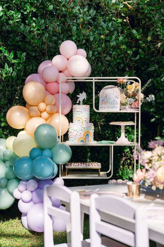 Для малышки Эммы оформили волшебный праздник на заднем дворе с обилием шариков и радужной гаммы! Гостей на входе встречал мольберт с тематическим плакатом, украшенный нежной радугой из шаров.