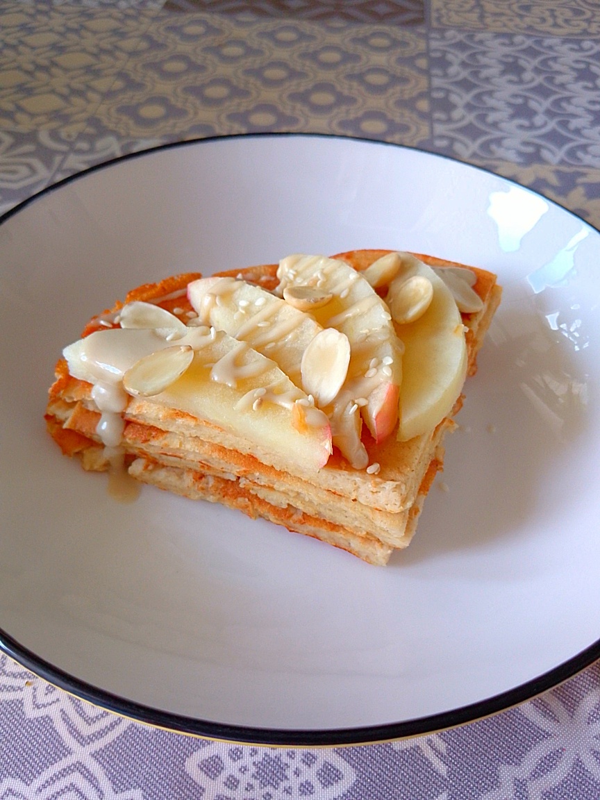 Смолоть овсянку в кофемолке в муку. Смешать все ингредиенты до однородности. Выливаем массу в разогретую сковороду и выпекаем с двух сторон. Переворачиваем с помощью плоской тарелки. Мне понравилось сочетание: яблоки и урбеч кунжутный.