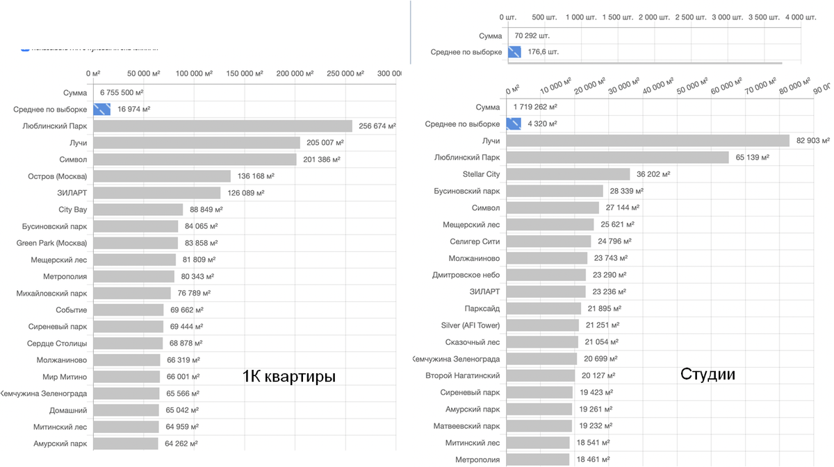 Если студии – теперь это «фу», то что купить вместо них? Первыми на ум приходят однушки, но давайте посмотрим на аналитику. На графиках выше показана общая площадь строящихся 1-комнатных квартир и студий в самых популярных проектах. Возьмем, к пример, ЖК «Лучи», на который я недавно делал обзор. Общая площадь однушек в проекте составляет 205 тыс. м2, а студий – 83 тыс. метров. Сейчас доля студий составляет около 10%, а однушек – 30%. С учетом того, что в новых проектах студии перекочуют в однушки, доля этих квартир увеличится до 40%!