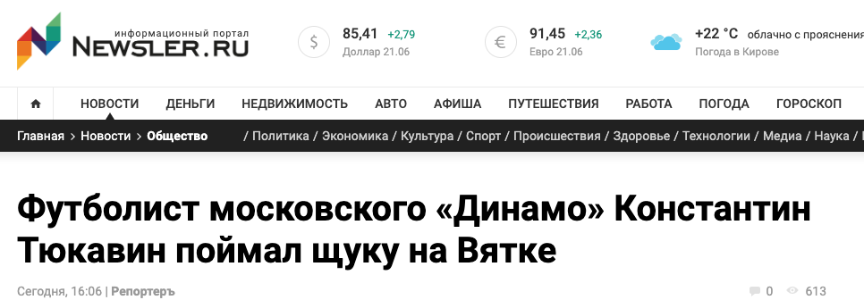 "Охрана рыбов" продолжает рассказывать об е-буднях города Кирова, что стоит на реке Вятке. Оказывается, что в реке Вятка, на которой стоит Киров, 650-летие которого начали отмечать 12 июня и закончат только в сентябре, водится рыба. Конкретно- щуки. Или щука. И футболист московского «Динамо» Константин Тюкавин, 21 года отроду, с супругой Алёной Шабурова находясь в славном граде Кирове решили заняться рыбалкой. Во время которой и поймали щуку. На рыбные котлеты. Что оказалось целым событием: об этом написали все кировские СМИ и блогеры. "Охрана рыбов" отмечает, Контантин Тюкавин в этом, 2024 году был признан что лучшим футболистом России 2024 г. Только он сумел поймать в реке Вятка щуку, которую его жена Алена пустила на котлеты. Это была новость года Кирова, которая затмила даже начало празднования 650-летия города Кирова, что на Вятке, в которой все еще есть рыбы. По крайней мере, была: -Рыбов продаете? -Нет, только показываем . -Красивое.