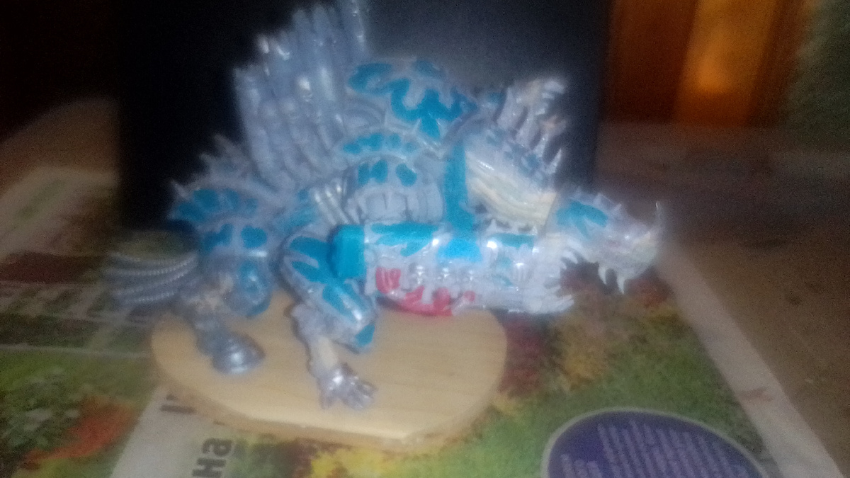 Что же, вот и юбилейный выпуск. В репортах это чудо хаоситской техники уже мелькало. Пришло время представить его воочию. Прошу прощения за не очень хорошее качество фотографии, просто для съёмки с ближней дистанции он слишком большой (для переноски стоя - тоже, кстати), поэтому пришлось снимать с отдалением. Итак, что же такое зверь кузни? Это произведение искусства Темных Механикум и варп-кузнецов легионов-предателей. Это передвижная огневая платформа, внутри которой сидит привязанный демон. Вооружен он может быть пушками "Аид" или плазменными пушками. Ещё одна может ставиться на "морду" зверя. Вместо него может быть и голова, вооруженная челюстями. Это само по себе универсальная огневая мощь. Большой радиус поражения и высокая огневая мощь делает эту машину хорошей, как против пехоты, так и против техники.