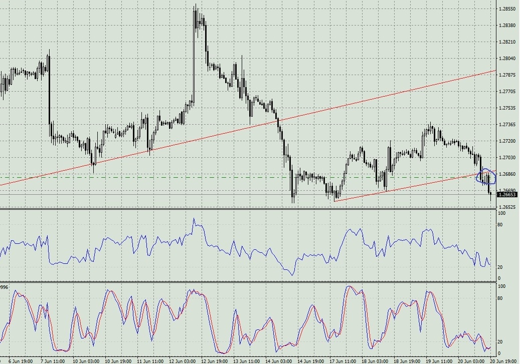 Смотрим график дейли - небольшой восходящий тренд пробит вниз: После пробоя 3 дня откат и сегодня поход вниз. Переходим на часовой график и видим, как после отката цена пробивает линию поддержки - неплохая точка для входа: Пока что это всё.