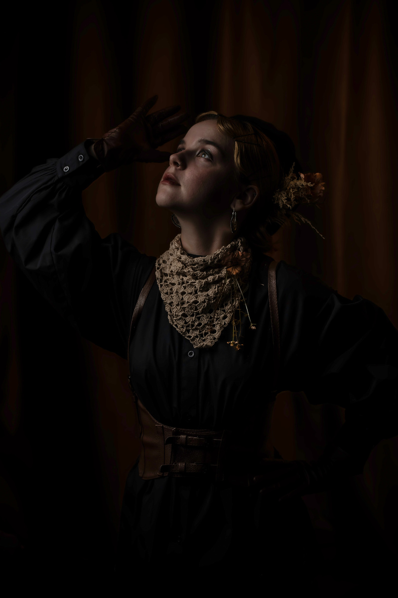 Редким источником для вдохновения на такую съемку у нас оказался фон. Его теплый коричневый цвет натолкнул нас на фотосессию в сценическом стиле. Съемки мы делали дома. Рубашка с рукавами - буфами, кожаный корсет и перчатки, серьги в этническом стиле, вязанный платок, берет и раздербаненный букет для антуража) Черная рубашка с рукавами-буфами придает образу объем и тем самым акцентирует внимание на талии. Рукава также заполняют кадр и делают картинку более сценической. Корсет всегда отсылает нас к историзмам. Последняя коллекция Джона Гальяно для бренда Марджела была исключительно построена на корсете и объемах. Мы подобрали в образ перчатки в цвет корсета - глубокого коричневого цвета (из-за чего мне и стал этот образ напоминать стимпанк). Наполняя образ в области груди, мы использовали вязаный платок бежевого цвета, который так хорошо сочетается с коричневыми перчатками, корсетом и фоном. Так как образ больше сценический, мы купили в магазине готовые пластиковые букеты и разодрали их