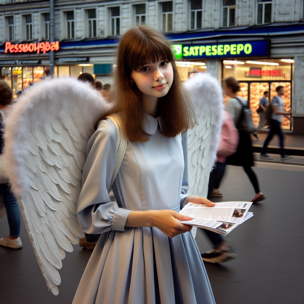 Маша стояла у метро. К ее спине были приделаны огромные с неё ростом крылья из облезлых растрепанных грязно-серых перьев. Она изображала ангела и раздавала прохожим листовки с рекламой местной сувенирной лавки. «Подарки с небес – найдите свой ангельский сувенир!» — не стесняясь, зазывал слоган с рекламки.