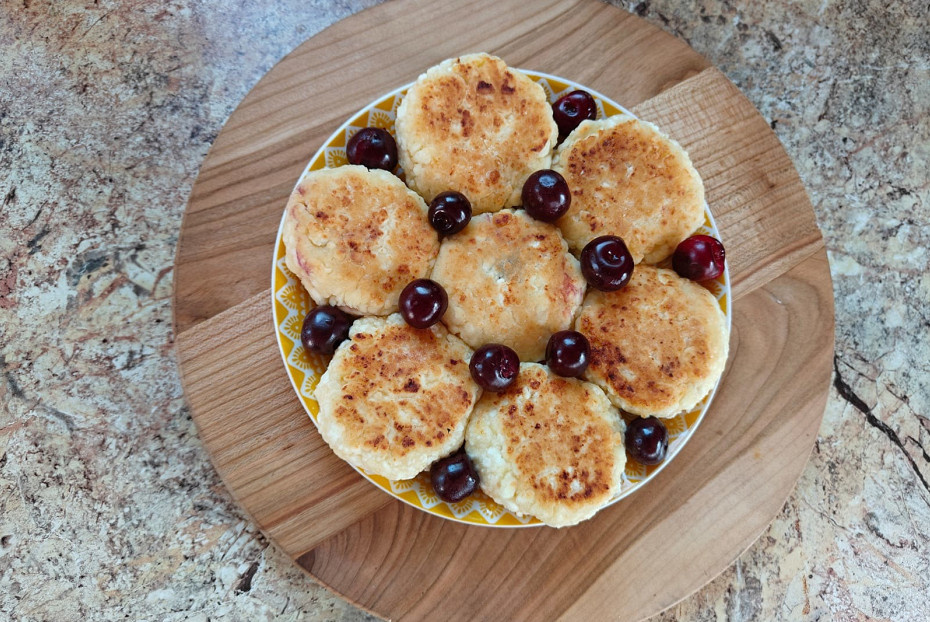 10.Залепить края сырника, чтобы вишня оказалась внутри.