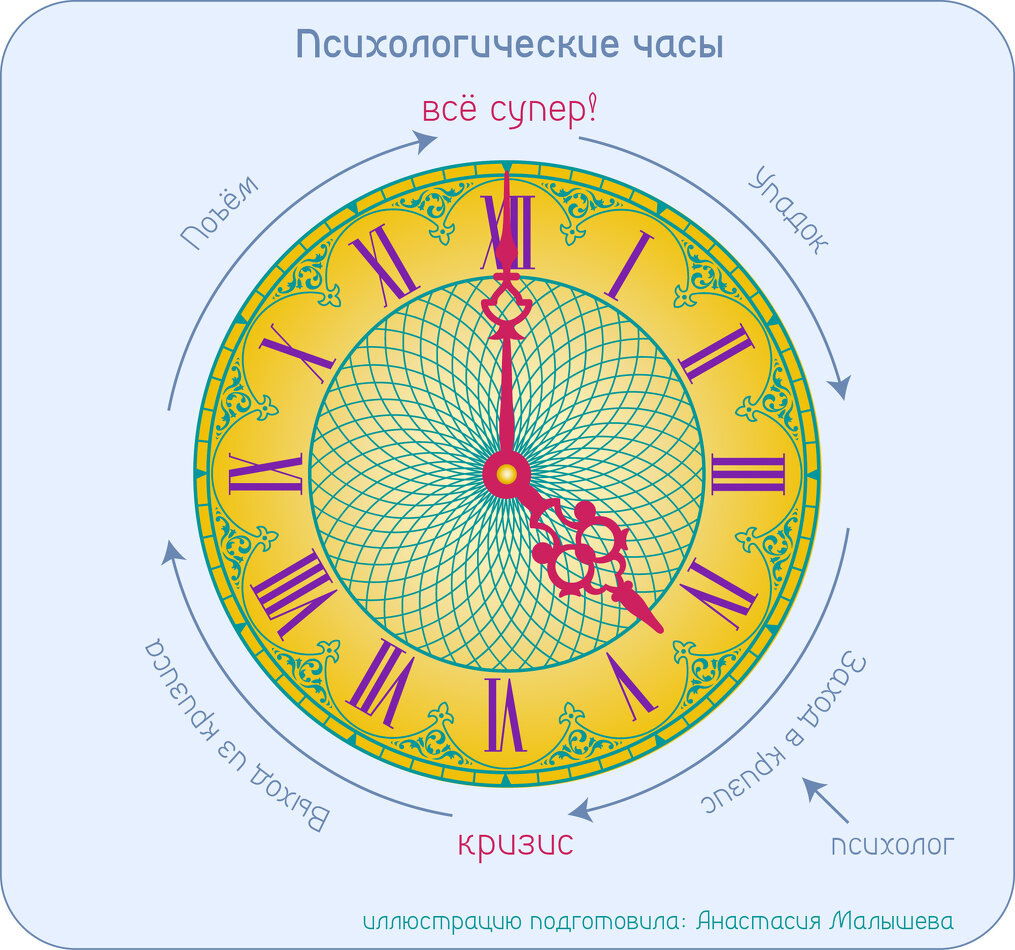 Если посмотреть на циферблат, то 12 часов – это отличное состояние человека, он полон сил и радостен. На промежутке от 12 до 3 часов состояние ещё хорошее, но начинается спад. С 3-х часов до 6-ти – это заход в кризис. 6 часов – это дно психики, здесь возможны затопления бессознательным, самый пи кризиса. С 6 до 9 происходит выход из кризиса. С 9 до 12 подъём сил. И потом опять по кругу. К психологу человек обычно попадает в 4-5 «вечера». И как раз с психологом проходит кризис. Кризис – это ситуация трансформационная и ситуация, для которой организм и психика готовятся. Если просто снять симптомы и не зайти в кризис, то не будет действительно трансформации и логичного выхода. Психика, у которой просто «затёрли лапкой» симптомы будет при первом удобном случае пытаться свалиться в кризис.