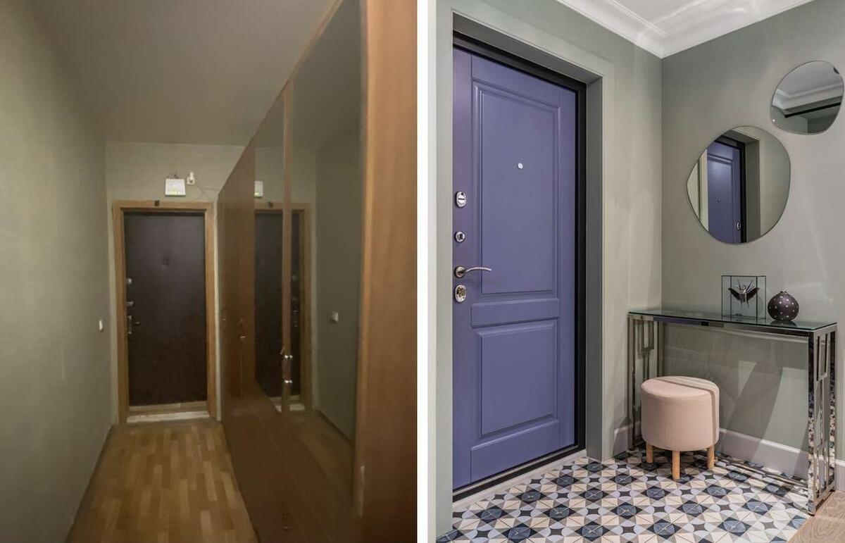 Разница до и после переделки кардинальная Эту небольшую двухкомнатную квартиру 57 кв. м в панельном доме серии П-47 оформила дизайнер Наталья Скрябина для семьи, которая приезжает пожить в городской квартире из своего загородного дома. Посмотрим, как оформили небольшую прихожую. Из нее ведут сразу два коридора в разные зоны: взрослую и детскую. Их разделили намеренно, чтобы сделать пребывание в квартире более комфортным. Прихожая точно нуждалась в капитальном ремонте — это было пространство с неактуальными обоями, громоздкой мебелью и мрачной входной дверью. Шкафы не доходили до потолка, на них постоянно скапливалась пыль. В тесном пространстве было крайне неудобно открывать и закрывать дверцы, а плохое освещение искажало помещение, акцентируя внимание на его недостатках. Новый интерьер кардинально отличается от предыдущего. Прихожая получилась светлой, просторной, с качественным освещением. Входную дверь заменили и сделали ее акцентной, обрамив черным профилем. Дверные наличники окрас