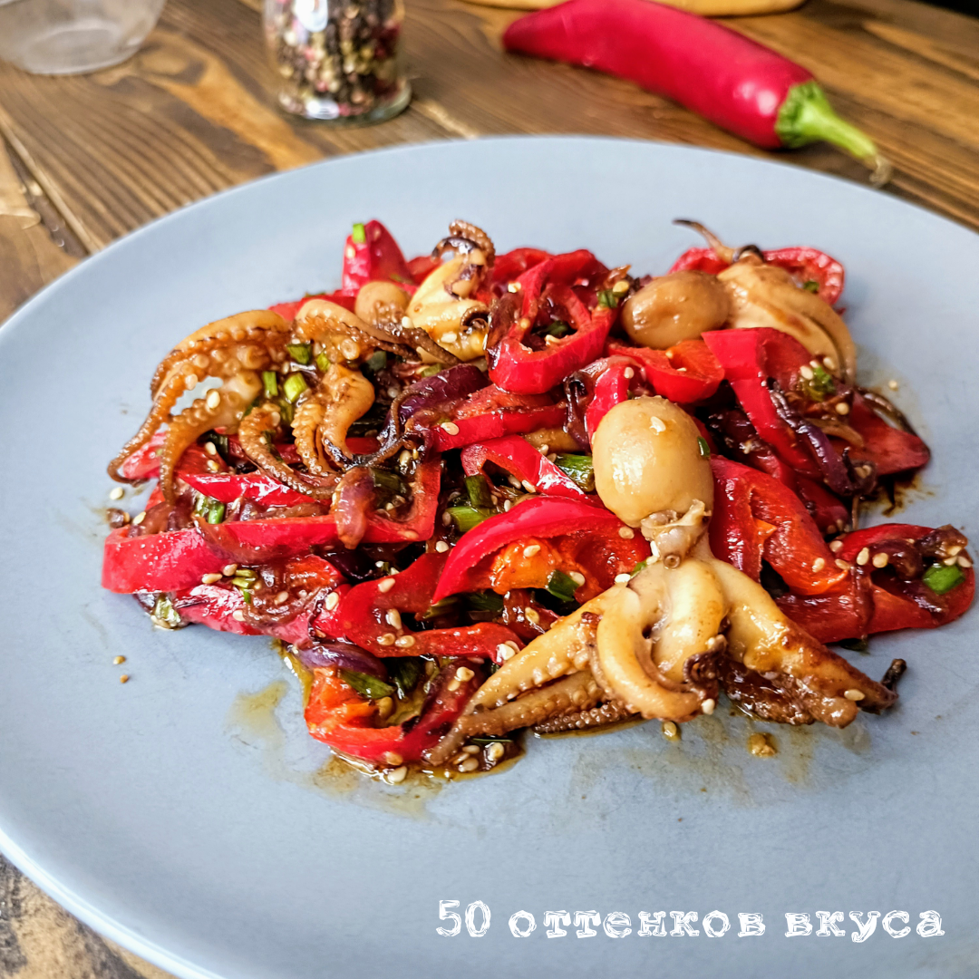 Сытного стола вам мои голодные друзья! Что-то так захотелось захомячить чего-нибудь необычного. Из морепродуктов. Осьминог я думаю подойдёт в самый раз! Осьминоги я купил уже готовые к жарке. Они очищенные, их сталось только закинуть в сковородку и приготовить. Сначала обжариваем лук. У меня фиолетовый, но можно взять и обычный круглый. Лук режем полукольцами и хорошо его жарим до золотистого цвета. Далее, в сковороду закидывает нарезанный небольшим кусочками сладкий перец и помешивая готовим пару минут. У меня перец Рамиро, поэтому я нарезал его просто кружками. Если вы возьмите болгарский перец, то режет его смела на тонкие крупные полоски. К готовым овощам закидывает осьминогов. Не забудьте их сначала почистить, если это необходимо. Готовим все помешивая, до момента когда испарится вся жидкость которая выделилась из осьминогов. Долго осьминогов готовить нельзя, иначе они станут резиновыми. Как только вся жидкость испарилась, ставим мощность плиты на минимум. Вливаем г