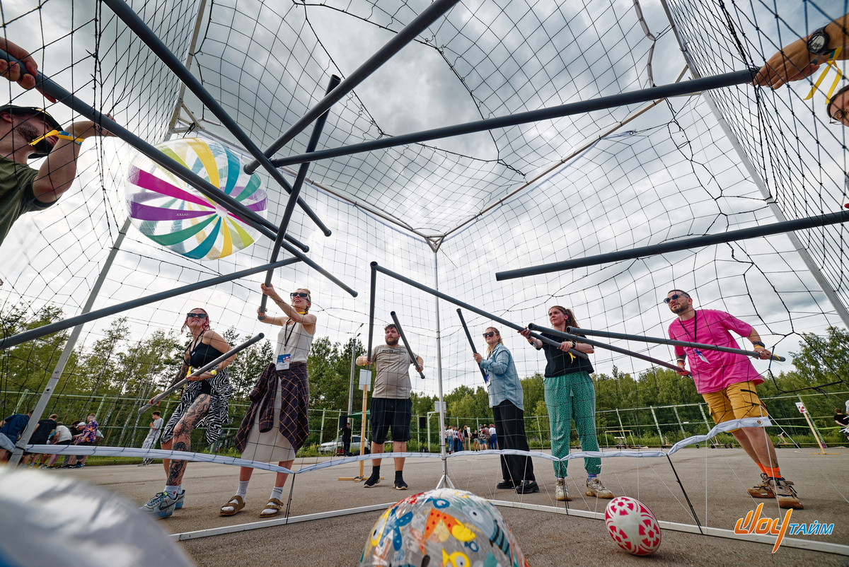 Площадка Магический куб: за ограниченное время командам нужно с помощью длинных трубок вынуть мячики из куба через отверстие в верхней грани. Один участник тут — совсем не воин, да и двое-трое тоже.
