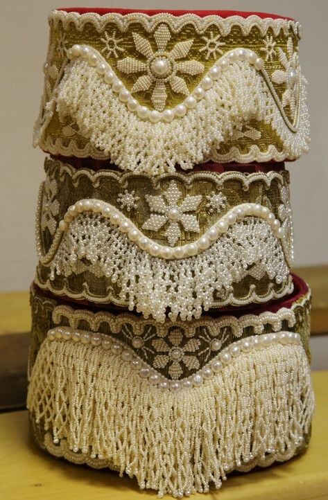 Девичий головной убор - перевязка, которая в свадебных причитаниях становилась символом вольной жизни, волюшкой, красотой. Каргопольские перевязки представляли собой обруч шириной пальца в четыре, обтянутый кумачом с нашитым золотным галуном. Спереди перевязки украшались речным жемчугом, бисером, из которых так же делалась поднизь в один или несколько рядов. Сзади к головному убору пристёгивали флажки, прикреплённые на прут 3-4 ленточки, которые соединялись «прозументом, и бахромка к низу пришивалась». На перевязку надевали шитый платок. Шитый — на Русском Севере значит вышитый. Каргопольские платы, вышитые золотной нитью, были особой красоты.