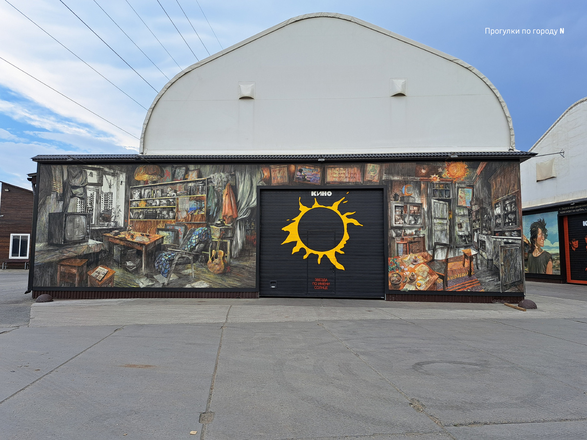 И теперь уже не одна стена ангара «Фанерного мира» украшена изображениями группы, самого музыканта и репродукциями его рисунков. В общем, эти муралы воссоздают фрагменты из биографии и творчества Виктора Цоя.