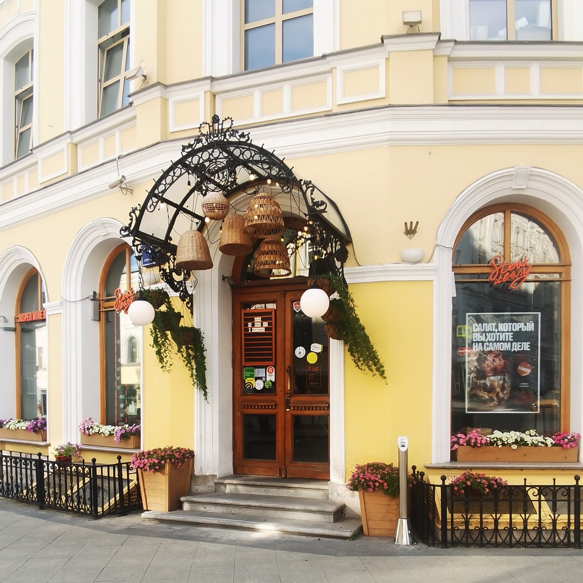 Именно в этом ресторане мы оказались благодаря расположенному по соседству «Новому театру», поэтому и получилось в один день оказаться здесь два раза: сперва я зашёл сюда один перед спектаклем, выпил бокал вина с салатом, забронировал столик, а уже потом мы всей семьёй вернулись сюда на ужин.