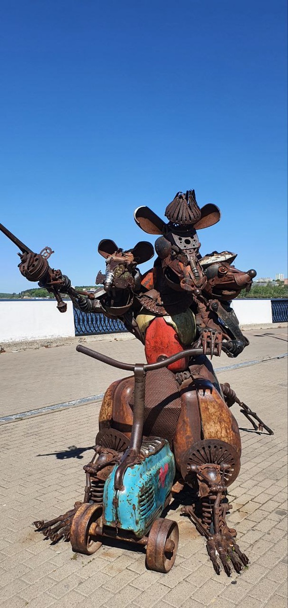 Знаете, где живет Мышиный Король? В Ижевске, на берегу водохранилища. Три головы , одна из них в ковбойской шляпе, усики, глазки-бусинки, все навевает страх и ужас. Восседает не на троне, а, как и положено в Ижевске, уютно устроился на некоем "средстве индивидуальной мобильности" с моторчиком. Три головы, а лапы только две, такой же как в балете "Щелкунчик". Одной лапой держится за руль, в другой - шпага. Ох, и грозен Мышиный Король! А это сосед Мышиного Короля. Нет, это не Валли, и не Р-200 из "Звездных Войн". В левой клешне грозная палка, в районе предплечий две трубы, как два оружейных дула. Головы нет, а зачем она, если у тебя в руках оружие, а думает за тебя Мышиный Король. Третий друг - "Рыцарь на крокодиле". Крокодил смотрит на рыцаря, вывернув голову назад, как бы желая спросить "Куда едем?" Рыцарю крокодила мало, он еще и на велосипеде... Чем больше транспортных средств, тем лучше... Четвертый подчиненный Мышиного Короля - особо опасный персонаж, вокруг него - ограда. Он хор