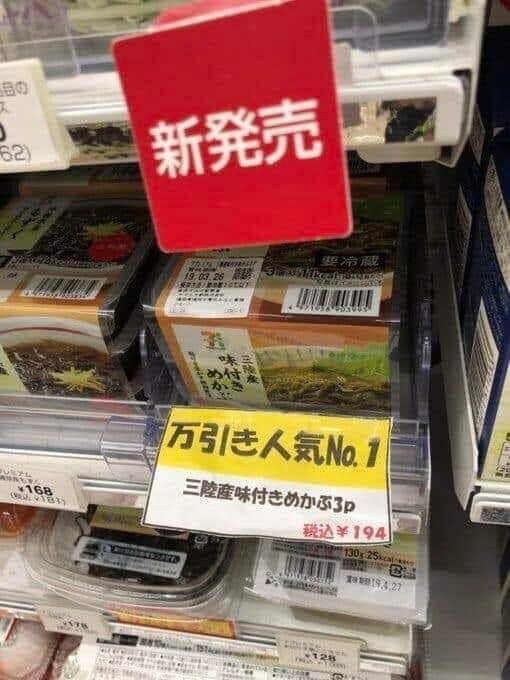 На фото на красной табличке написано "новинки". На жёлтой - "воруют чаще всего".😂 Для чего вообще нужна такая табличка?😅 Кстати, воруют чаще всего маринованную мэкабу - это корень всем известной вакамэ.