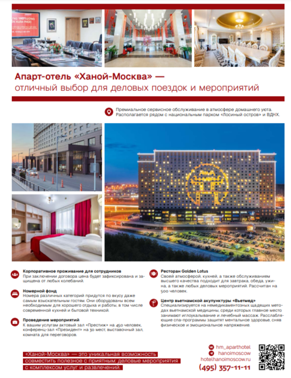 Всероссийский отраслевой журнал «Здравоохранение России» опубликовал статью «Апарт-отель «Ханой-Москва» - отличный выбор для деловых поездок и мероприятий»: - корпоративное проживание для сотрудников; - богатый номерной фонд; - проведение мероприятий «под ключ»; - ресторан «Golden Lotos»; - центр вьетнамской акупунктуры «Вьетмед». «Ханой-Москва» - это уникальная возможность совместить полезное с приятным: деловые мероприятия с комплексом услуг и развлечений.