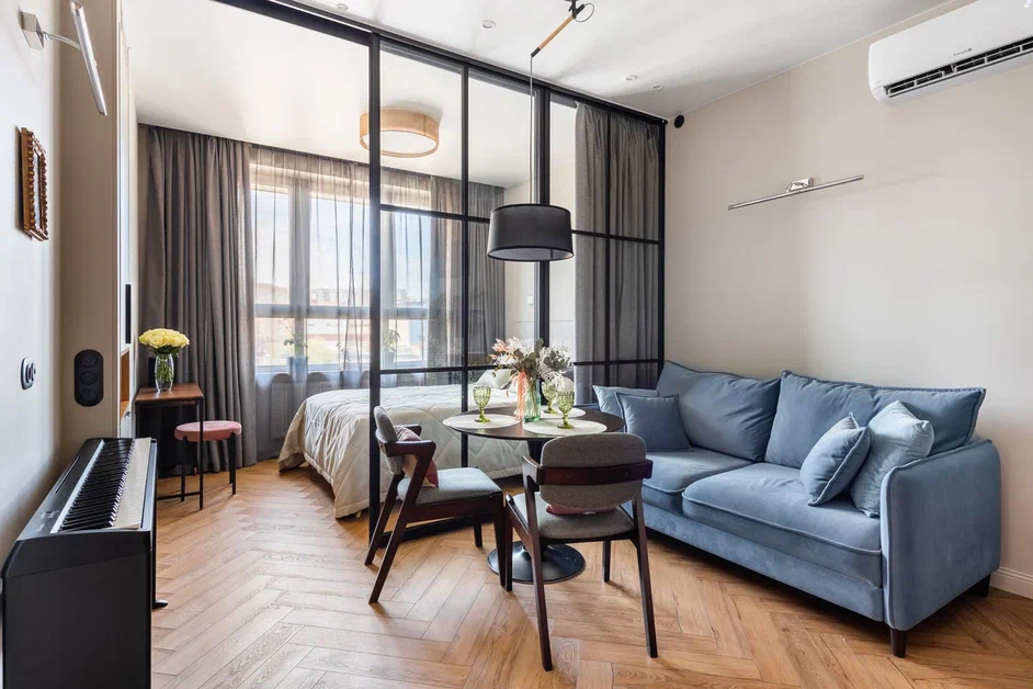 В комнате 21,2 кв.м с одним окном находится сразу четыре зоны: полноценная спальня, кухня, столовая и гостиная. Для отделки стен выбрали моющуюся светлую краску, а на полу «елочкой» уложили кварц-винил.