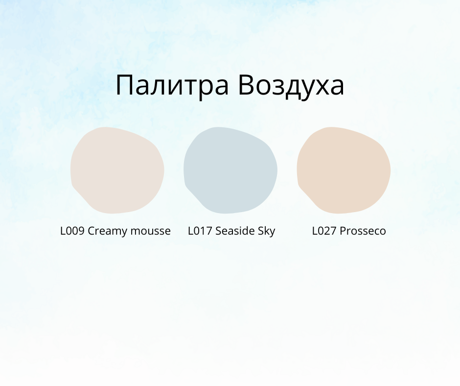 Вызов энергии Воздуха, Земли, Огня и Воды Мы в düfa стремимся создавать краски, которые не только украшают дом, но и наполняют его энергией, отражающей вашу личность и жизненные устремления. Наша новая палитра düfa Home представляет собой элементарную цветовую палитру, вдохновленную четырьмя стихиями: Воздухом, Землей, Огнем и Водой. Эти цвета помогут вам создать гармоничное и вдохновляющее пространство. Палитра Воздуха Цвета воздушной палитры воплощают утонченную красоту легкости и прозрачности. Начинается с кремово-белого цвета L009 Creamy mousse и включает в себя мягкие, пастельные тона, такие как L017 Seaside Sky и L027 Prosseco, которые были отмечены как цвет года. Воздушные оттенки символизируют связь с высшими сферами знаний и понимания, принося ясность и легкость в ваше пространство. Эти цвета идеальны для домашних офисов, кухонь и других мест, где важны креативность и сосредоточенность. Например, используйте M049 Azure Eye на акцентной стене, дополнив ее прозрачной драпировкой