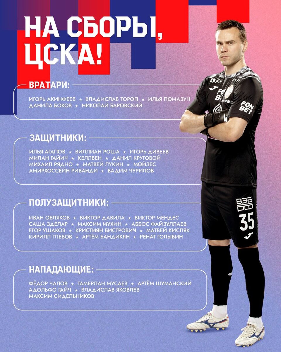 Сборы ЦСКА стартовали, новый тренер армейцев приступил к работе и будет разбираться с обоймой на сезон, а мы с вами обсудим список игроков на летние сборы. Поскакали! В социальных сетях ЦСКА появился список игроков, которые примут участие в сборах. В этом списке 34 футболиста. Давайте разбираться! Среди вратарей — Акинфеев, Тороп, Помазун, Боков и Баровский. Как стало известно, Владимир Шайхутдинов отправится в другую команду на правах аренды, чтобы получать игровую практику. По информации Metaratings, воспитанник перейдёт в ульяновскую «Волгу», а аренда не будет включать опцию выкупа. Был уверен, что молодой голкипер будет подменять Игоря Владимировича, пока Слава лечится, однако, решили так. Вове — удачи! Очевидно, первым номером будет капитан. Тороп пока продолжает лечение и в ближайшее время на поле не вернётся. Баровский будет пылить в молодёжке. Помазун практически наверняка уедет в аренду или покинет команду полноценным трансфером. Правда, трансферное окно открыто до начала сен
