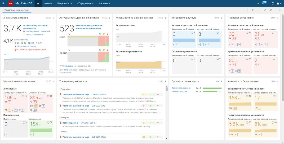 Одним из продуктов компании является MaxPatrol VM. Система помогает управлять уязвимостями в инфраструктуре. Благодаря её возможностям защита инфраструктуры становится более надёжной и труднодоступной для злоумышленников. Невероятная скорость работы алгоритмов и экспертов позволяет получать информацию о трендовых уязвимостях в течение 12 часов.