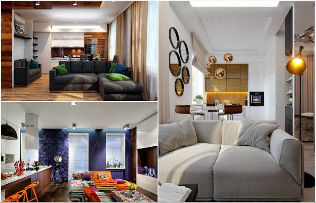 Объединение кухни с гостиной – это не только дань моде, но и рациональное решение для студий или квартир со скромной жилплощадью. В статье мастер мебельщик расскажет, как правильно распределить пространство, чтобы обе зоны дополняли друг друга и не перегружали пространство. Индустриальный стиль Безукоризненный интерьер кухни, оформленной в индустриальном стиле, с лаконичным и функциональным гарнитуром, простым металлическим стеллажом и оригинальным столом из дерева и бетона, который отделяет пищеблок от гостиной. Контрастное сочетание Эффектная черно-белая гостиная с камином, оригинальным креслом, отделенная от небольшой кухни широкой барной стойкой, которая также выполняет функции рабочей поверхности и обеденного стола. Уютное пространство Чудесный интерьер небольшой уютной кухни с минимальным набором мебели и барной стойкой, которая отделяет пищеблок от зоны отдыха с угловым диванчиком и круглым столом. Гламур Просторное белое помещение, которое вместило в себя кухню открытого типа с