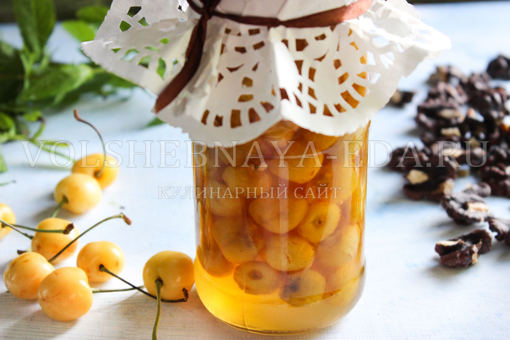 Банки переворачиваем вверх дном, укутываем пледом и оставляем до полного остывания, после чего отправляем на хранение в сухое и темное место. Подавать варенье из черешни с орехами можно сразу, но лучше все же дать ему настояться хотя бы пару недель.