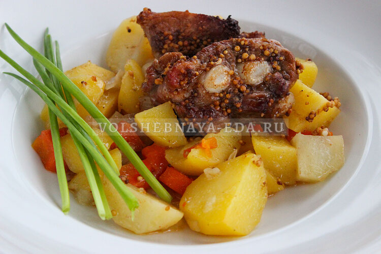 Готовить жаркое из свинины с овощами будем в стеклянной форме с крышкой. Вода не добавляется — жидкость выделится в достаточном количестве из овощей (лука и моркови) и маринада. Мясо с овощами в стеклянной форме будет медленно томиться в собственном соку, а потом самостоятельно подрумянится. Вкусно и без особых хлопот. Приготовить маринад для ребрышек. Смешать: горчицу, соевый соус, кетчуп чили и соус барбекю (здесь использован готовый соус BBQ c жидким дымом), а также пару зубчиков чеснока, пропущенных через пресс. Если у вас соевый соус не очень соленый, то можно добавить дополнительно 1/3 ч. л. соли. Если вы не любите сладкие маринады, то добавьте в список ингредиентов лимонный сок. Свиные ребрышки зачистить от пленки, нарезать крупными порционными кусочками. Обмазать со всех сторон маринадом, оставить минут на 20-30, пусть промаринуются, пока вы занимаетесь овощами. Очистить лук, морковь и картофель (при желании можно часть морковки заменить тыквой — тоже будет очень вкусно). Наре