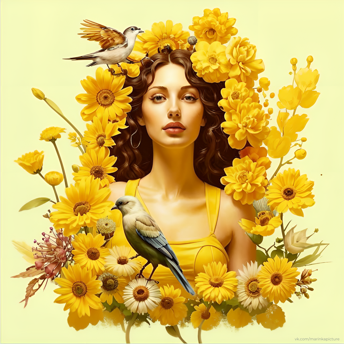 Желтый цвет - это символ солнца, радости и энергии. В древние времена желтый ассоциировался с богатством, мудростью и цветением. В живописи этот цвет часто ассоциируется с женственностью, добавляя образам нотку солнечного света и тепла. Он способен подчеркнуть красоту и изящество, придавая образу очарование.
